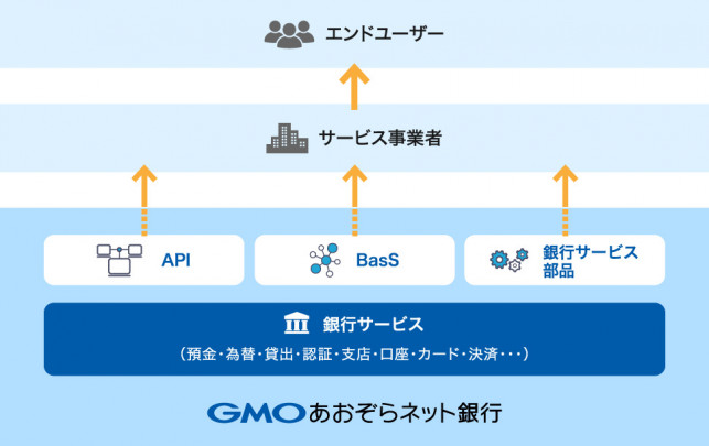 「 BaaS byGMOあおぞら 」とは、銀行でしか利用できなかった決済や入金通知などの機能を、お客さまのサービス上でかんたんに利用いただけるよう、各種銀行機能をパーツとして提供するサービス部品の総称です。