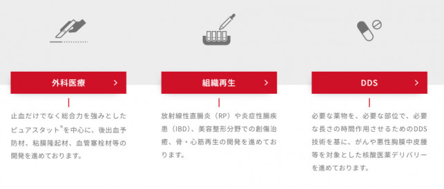 現在の国内での主力製品は吸収性局所止血剤「ピュアスタット」です。医療機器としての止血材で、100を超える研究機関や大学とマテリアル供給契約(MTA:Material Transfer Agreement)を締結しており、ペプチドプラットフォーム技術を活用し、グローバルに新用途を探索しており、今後は研究開発フェーズから販売フェーズへ移行し、収益化に向けた体制強化を図っております。
